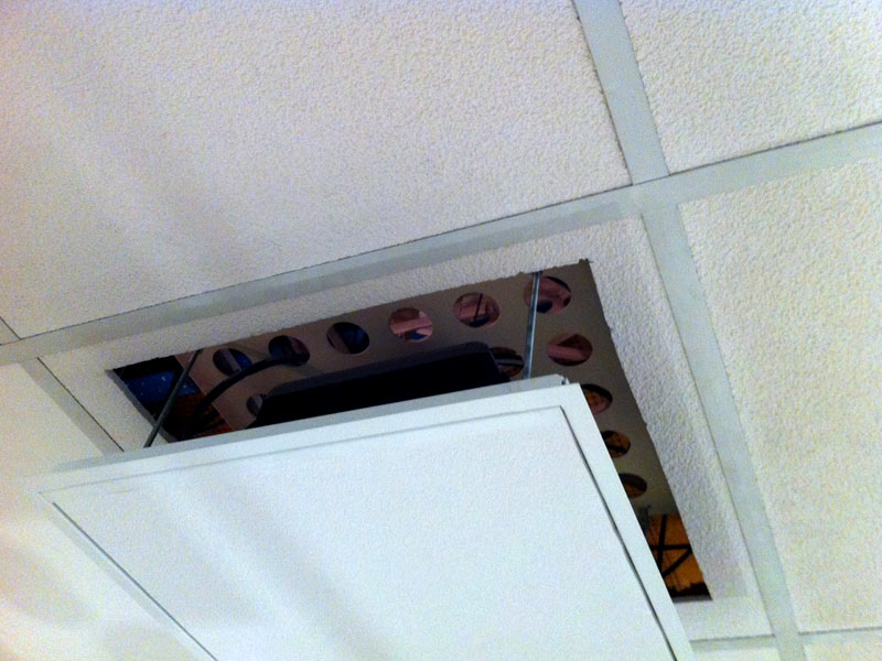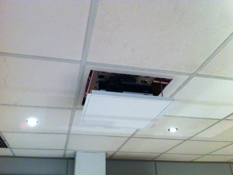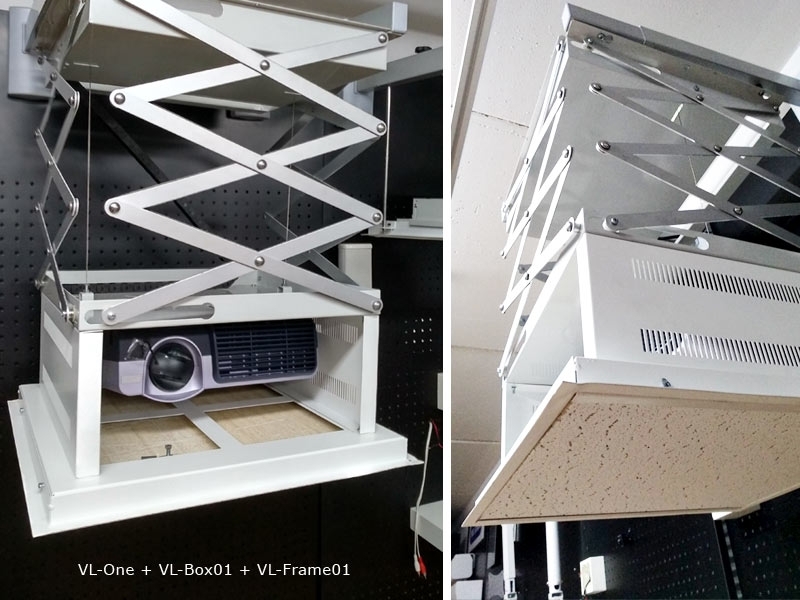 Der Ceymsa VL-Frame01 schließt den Beamer an dem VL-ONE Deckenlift nach unten ab. Durch den Abschlussrahmen verschwindet der Lift samt Beamer bei Nichtgebrauch in der Decke. Bei einer weißen Decke ist die Halterung durch den Rahmen fast nicht zu sehen und schützt damit etwas vor Diebstahl sowie vor Staub.