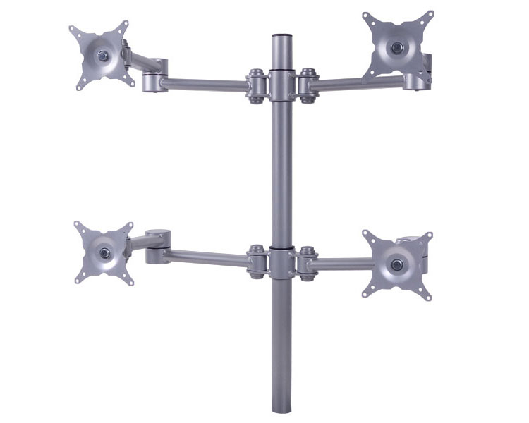 Diese Viewmate Lösung für vier Bildschirme besitzt ebenfalls das Schnellverschluß-Mechanismus wie die anderen Produkte, hat aber vier Gelenkarme. Somit kann man vier höhen- und tiefenverstellbare Monitore einsetzen.