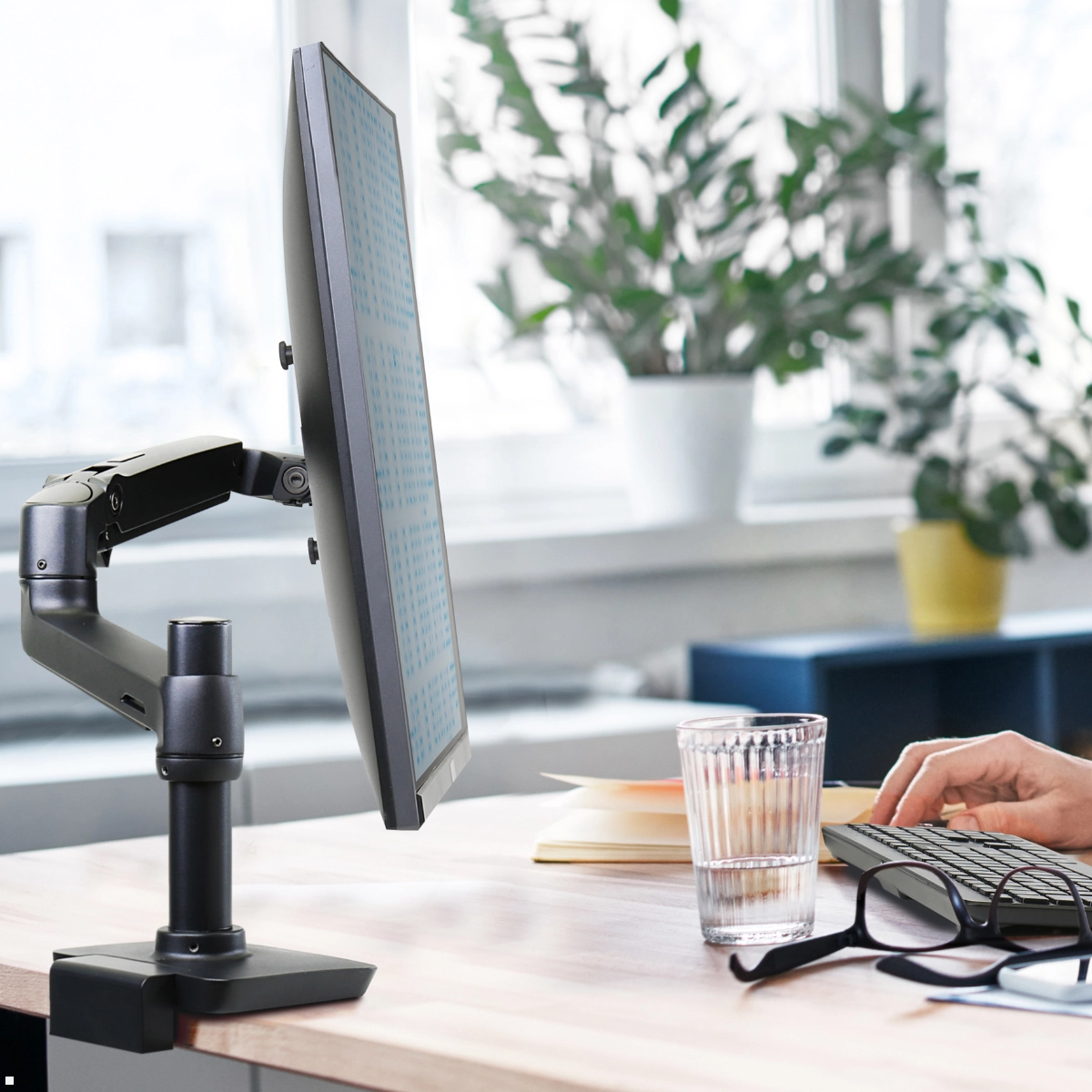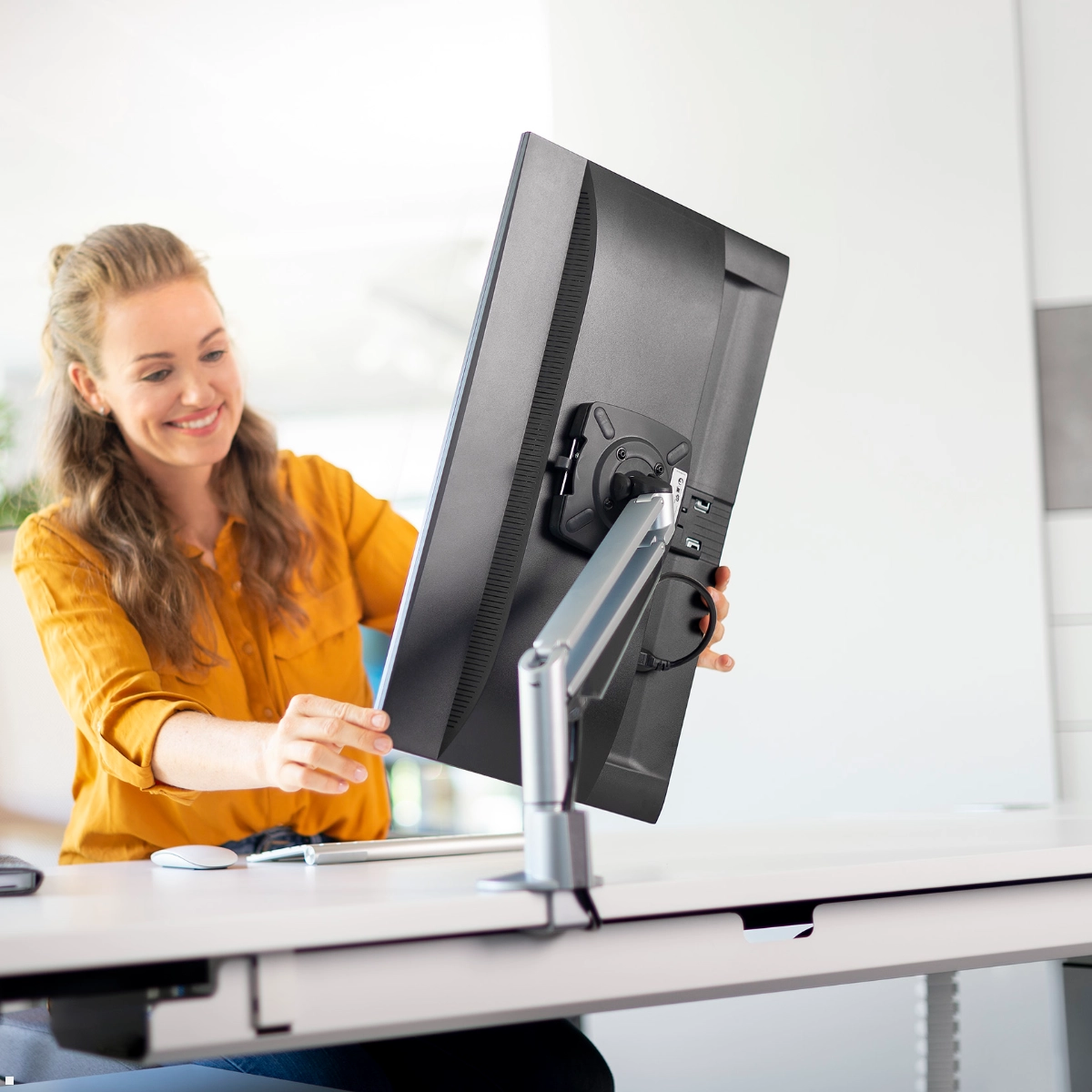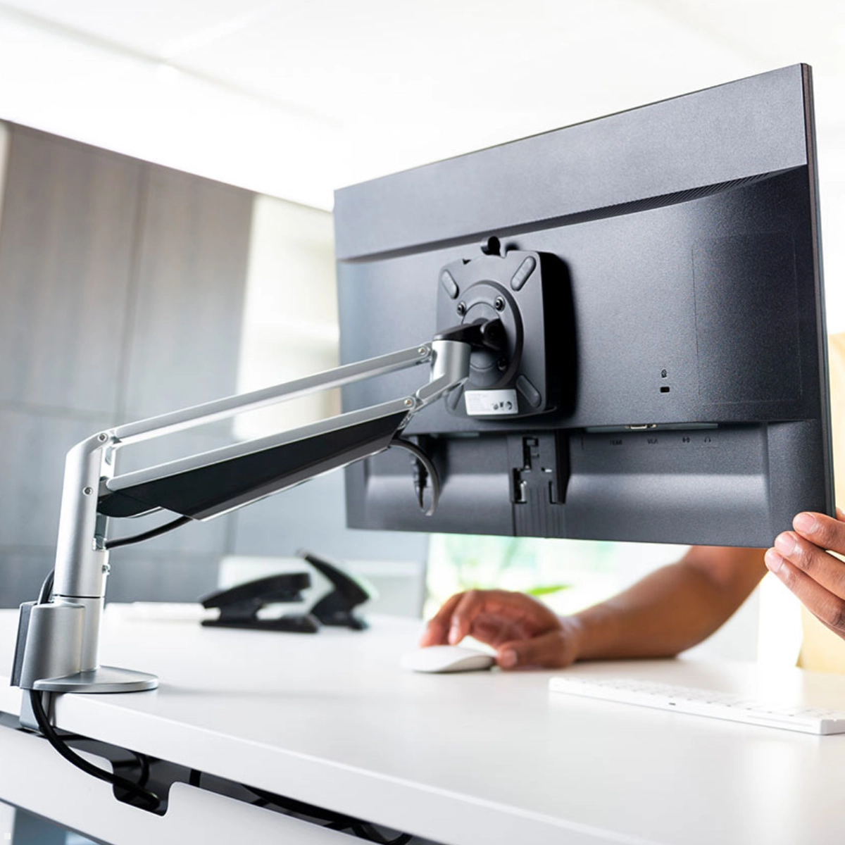Auf dem Markt existieren zahlreiche Monitorhalterungen und diverse Methoden, um Monitore auf dem Schreibtisch zu fixieren. Wenn ein Schreibtisch über entsprechend passende Bohrlöcher verfügt, kann ein Monitorarm mit einer Bohrschraubbefestigung verwendet werden und der Monitorarm über das vorhandene Loch befestigt werden. Für die meisten Anwender:innen, deren Schreibtisch kein Bohrloch / Durchtischloch hat oder die Möglichkeit einer Bohrung nicht besteht, ist eine schmale C-Klemme oder eine Tischklemme am besten geeignet. Monitorarm Tischklemmen werden fest an der Rückseite des Schreibtisches oder an der Seite befestigt und ermöglichen es, die Position des Monitors in drei Dimensionen zu verändern, d.h. er kann näher herangerückt werden, wenn die Rückseite des Schreibtisches zu weit entfernt ist. Dadurch wird auch wertvoller Platz auf dem Schreibtisch frei.