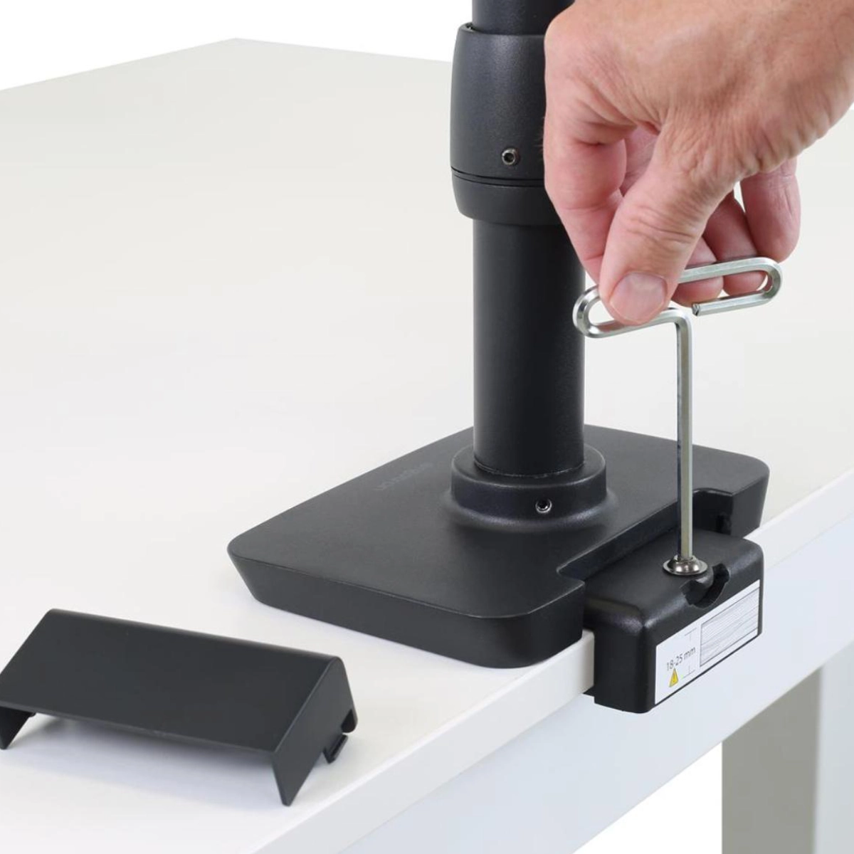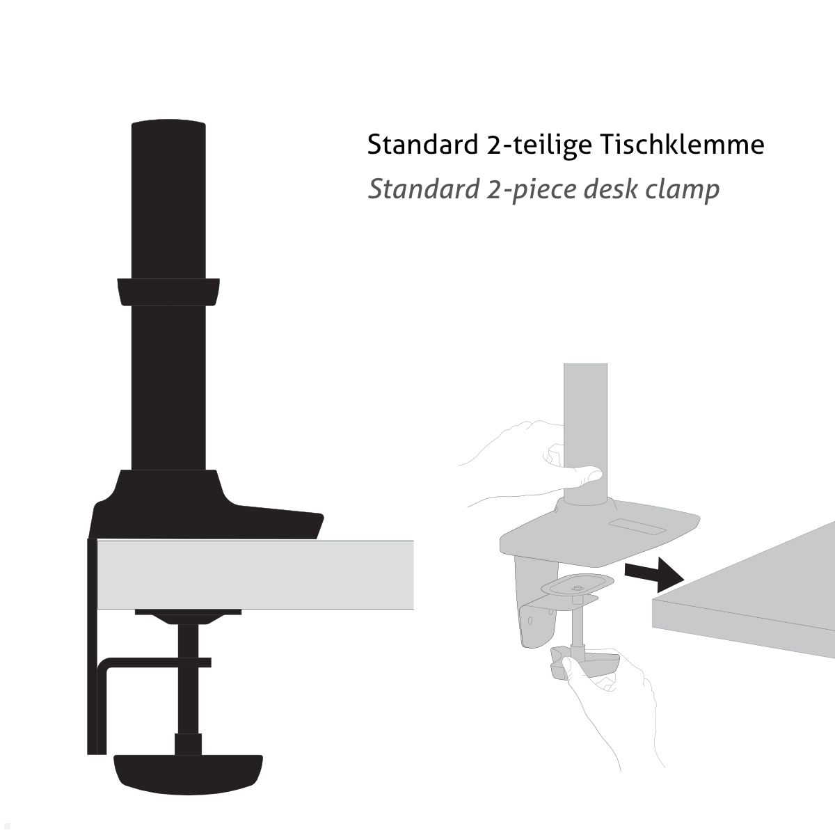 Die zweiteilige Standard Tischklemme ist eine traditionellere Befestigungsmethode, bei der die Klemme auf der Oberseite der Tischplatte angebracht wird. Diese Art der Montage bietet den Vorteil einer einfacheren Installation und kann bei den meisten Schreibtischtypen verwendet werden. Allerdings kann diese Tischklemme bei Kabelkanälen meistens nicht eingesetzt werden. Für Steh-Sitz Tische mit Kabelkanälen kann die sichtbare Klemme möglicherweise die Bewegungsfreiheit einschränken oder sogar die Funktion der Kabelkanäle beeinträchtigen. - Übertisch (Top Mount) C-Tischklemme: