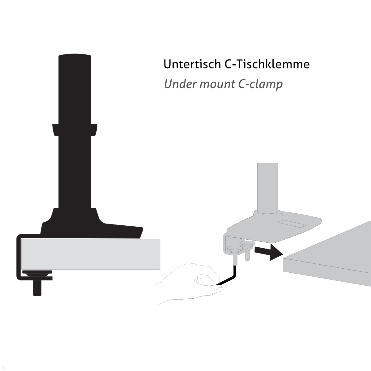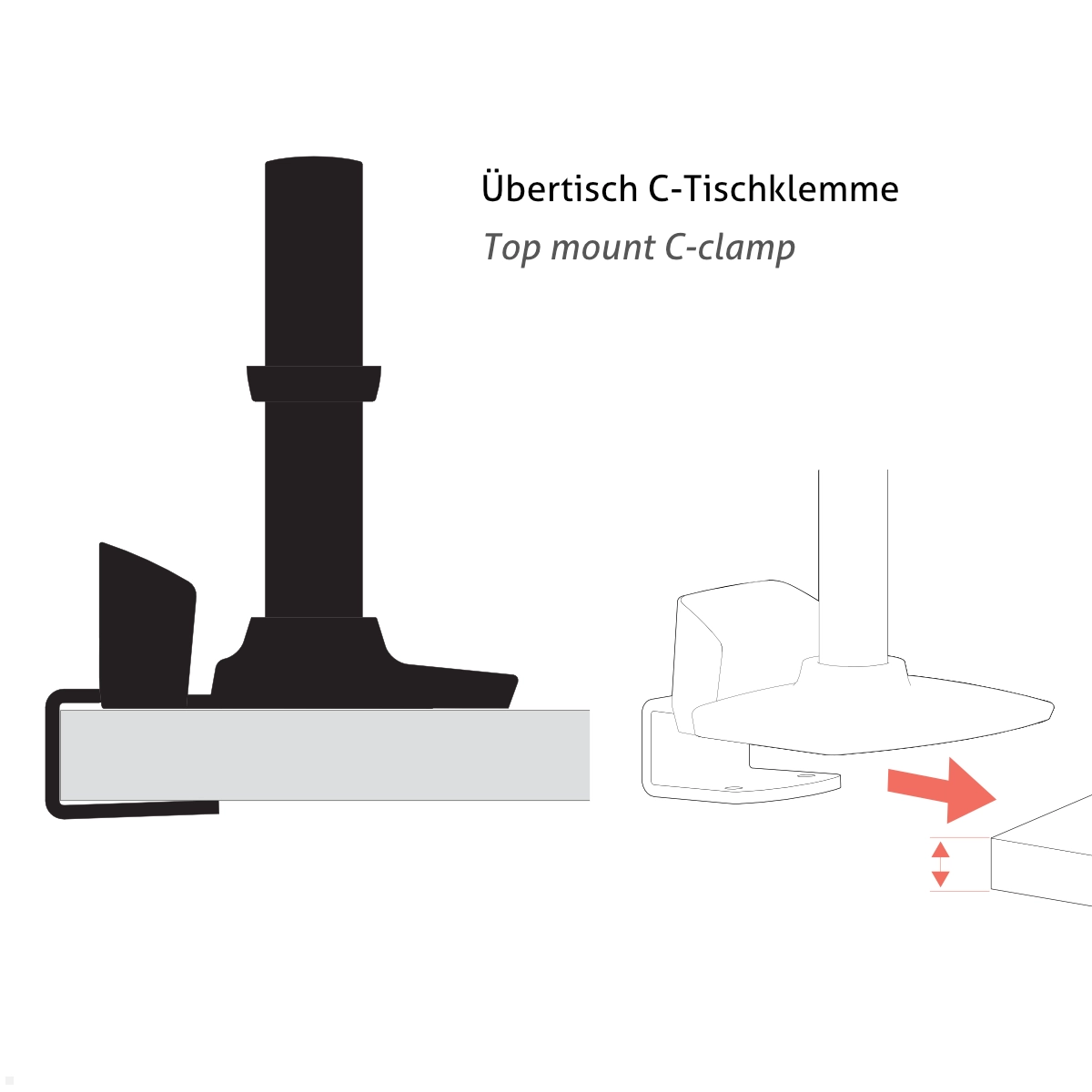 Die Übertisch (Top Mount) C-Tischklemme bietet eine Mischung aus den beiden vorherigen Montageoptionen. Die sehr schmale C-Klemme wird auf der Oberseite der Tischplatte angebracht, jedoch mit einer speziellen Konstruktion, die die Kabelkanäle nicht behindert. Diese Art der Montage ist ideal für Schreibtische mit integrierten Kabelkanälen, da sie eine saubere und ordentliche Arbeitsfläche ermöglicht, ohne die Funktionalität der Kabelkanäle zu beeinträchtigen. Für Steh-Sitz Tische bietet die Top Mount C-Tischklemme die Flexibilität, den Monitor je nach Bedarf zu positionieren, ohne die Bewegungsfreiheit des Tisches einzuschränken.
