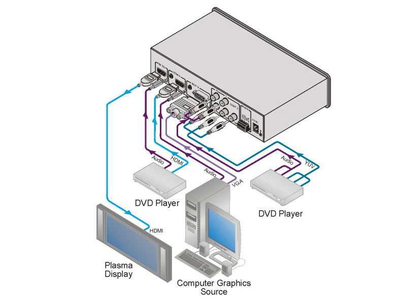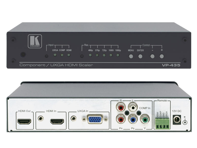 Der Kramer VP-435 ist ein Hochleistungs-Scaler für Komponentenvideo und Computergrafikvideo, jeweils mit unsymmetrischen Stereo−Audiosignalen, sowie HDMI. Das Gerät skaliert das gewählte Videosignal in eine Computergrafik- oder HDTV-Auflösung und koppelt das unsymmetrische Stereo-Audio in das HDMI−Ausgangssignal.