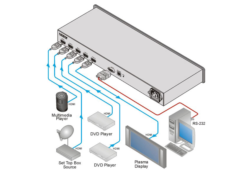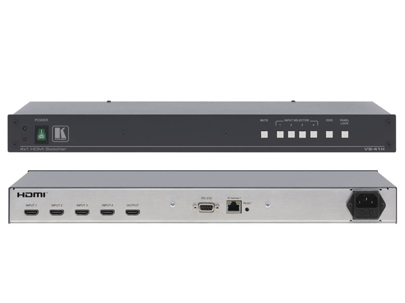 Der Kramer VS-41H ist ein Hochleistungs−Umschalter für HDMI−Signale. Er führt Reclocking und Entzerrung durch und schaltet einen von vier Eingängen auf den HDMI−Ausgang durch.