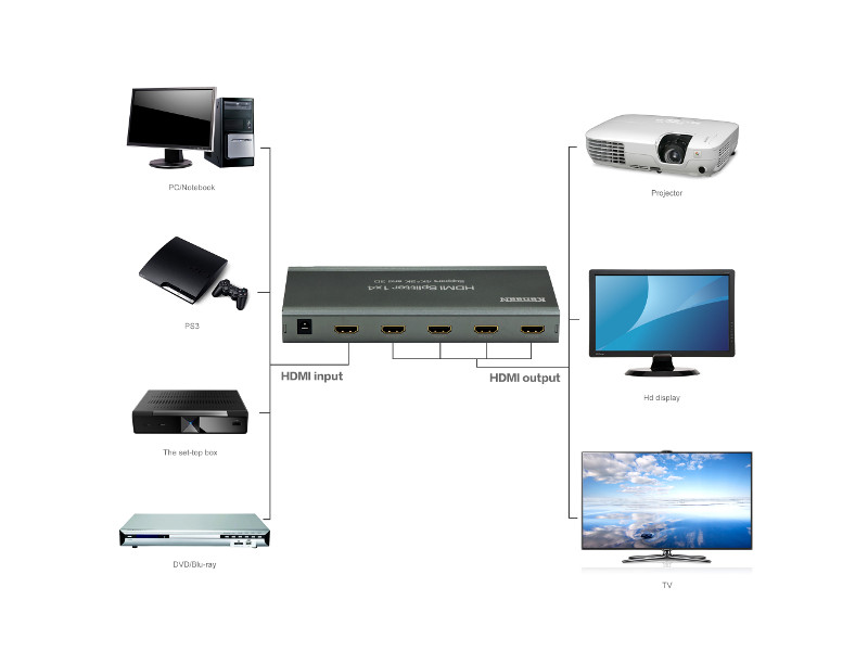 Der neue LEICKE KanaaN HDMI-Splitter auf 4x HDMI-Ausgänge ermöglicht Ihnen den Anschluss von zwei Geräten, wie etwa Beamer und UHD-TV, an eine Quelle wie z.B. UHD-Receiver, Blu-Ray-Abspielgeräte oder Spielekonsolen wie die PS4 oder Xbox One.