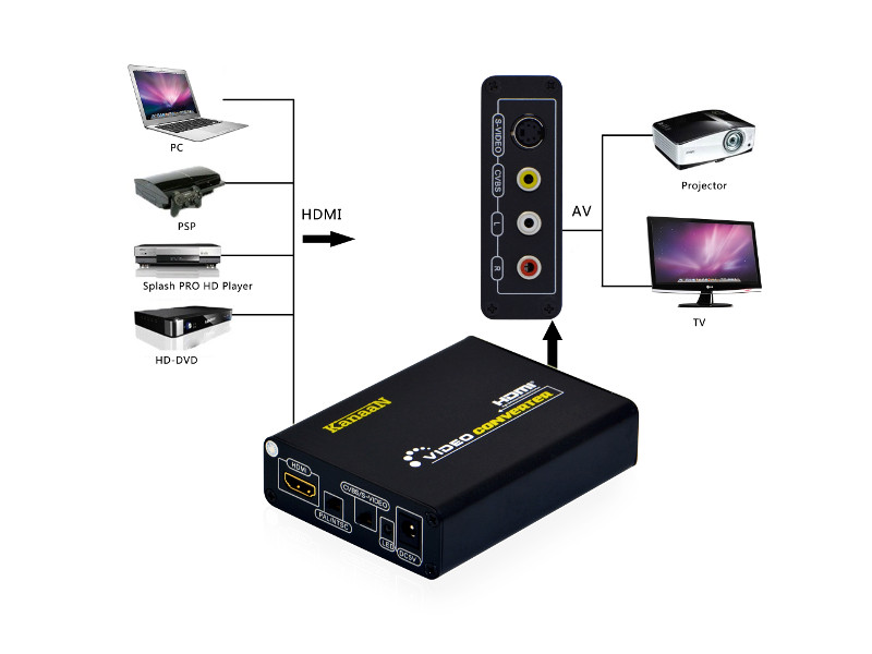 Der Leicke HDMI-zu-Composite/S-Video-Konverter von KanaaN ermöglicht es Ihnen, HDMI-Geräte wie zum Beispiel BluRay-Player, Spielekonsolen, Receiver oder PCs an ein älteres TV-Gerät ohne HDMI-Anschluss mittels Composite (Cinch Video, Audio r/l) oder S-Video anzuschließen.
