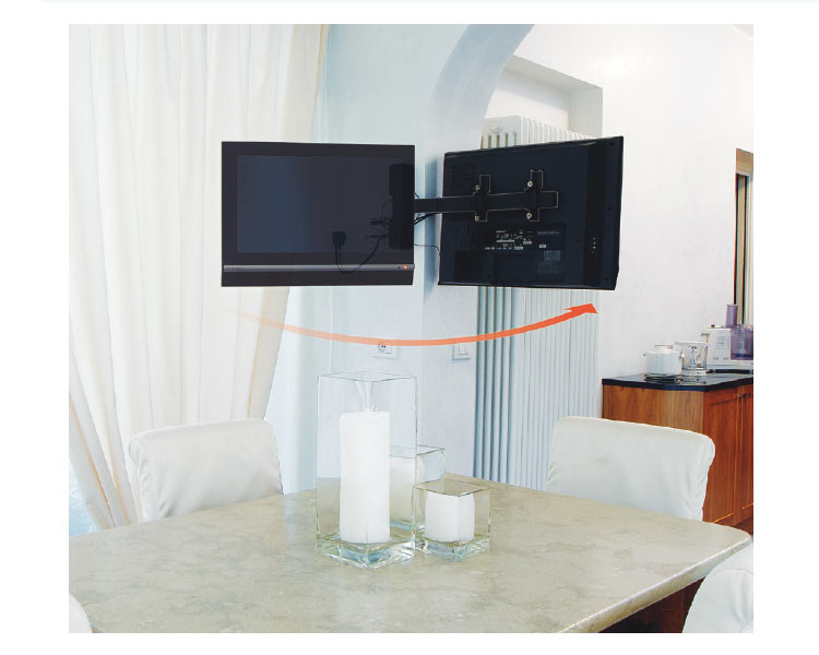 Mecatronica FLAG 50 - Die Mecatronica Serie „Flag “ schließt eine einzigartige Palette von motorisierten und manuellen Halterungen ein. Die Produkte der Serie „Flag “ eignen sich insbesondere für die Anwendung bei Säulen und Eckwänden, so dass man von verschiedenen Zimmern des Hauses fernsehen kann. Die motorisierten Fernseh Wandhalterung mit Fernsteuerung sind mit interner Kupplung ausgestattet und stellen eine innovative und zuverlässige Lösung dar, die die höchste Sicherheit im Hausraum gewährleisten kann. Die Produkte der Mecatronica Serie Flag können um bis zu 180 Grad nach rechts und links geschwenkt werden.