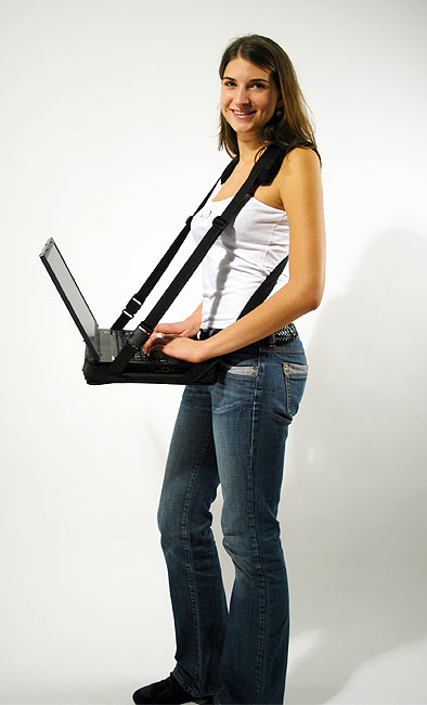 - Ergonomische Arbeitsfläche: Laptop sitzt sicher und stabil direkt vor dem Körper – ideal für längere Einsätze im Stehen oder Gehen.