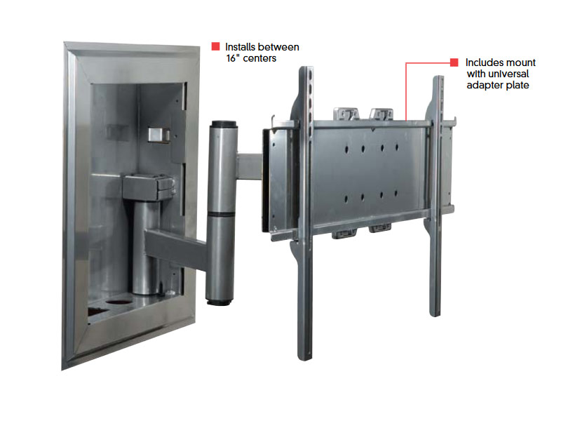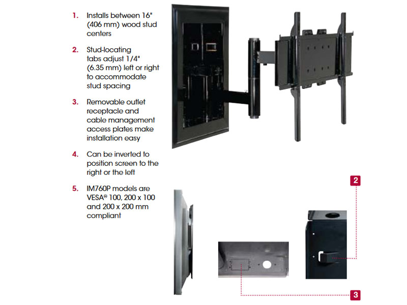 Mit der IM760PU Wandeinsatz-Halterung montieren Sie Ihren TV ganz flach an die Wand - und das mit Schwenkfunktion und Neigungsfunktion. Die Montage ist schnell und einfach. Sich selbst festklemmende Bleche zentrieren den Einsatz passend in die 16 “ Standard Befestigung.