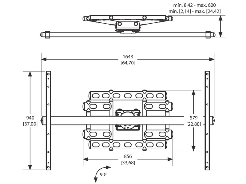 Die positive und negative Einstellung des Kippwinkels ermöglicht eine bündige Montage der Halterung. Dank der doppelten Schwenkarme kann auch der schwerste Bildschirm noch von der Wand zu Wartungs- oder Ausrichtungszwecken von der Wand weggezogen werden. Die Halterung bietet einen 90-Grad-Drehwinkel, der die Anbringung des Bildschirms in der Landschafts- oder Portraitanzeige oder jeder beliebigen Position dazwischen ermöglicht. Siehe auch PFW 6855 für VESA-Befestigungen und PFW 6857 für Panasonic 103-Zoll-Bildschirme.